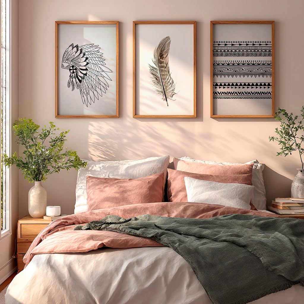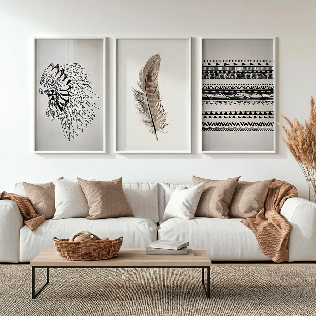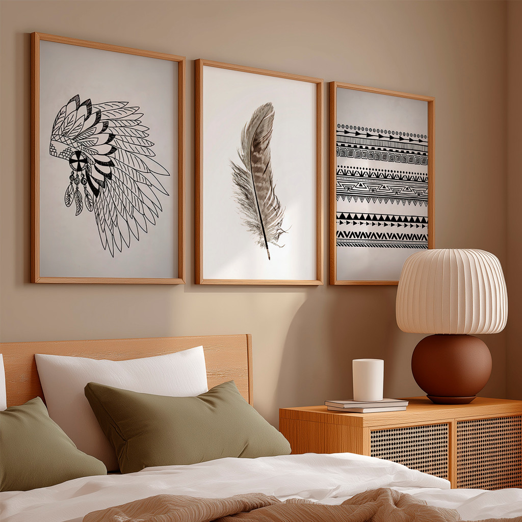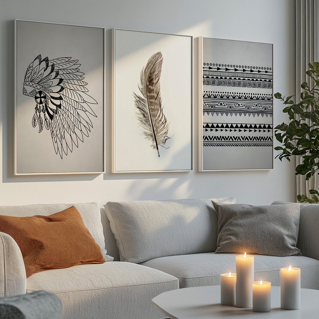 À esquerda, a representação linear e detalhada de um cocar de nativo americano simboliza sabedoria, força e respeito às raízes, trazendo uma energia grounded para o espaço. Ao centro, a fotorrealismo de uma única pena flutua suavemente, um lembrete constante de liberdade, clareza mental e novas perspectivas. O trio se completa à direita com padrões geométricos étnicos, conferindo ritmo visual e uma conexão tátil com tradições ancestrais, ancorando a composição com harmonia e foco.