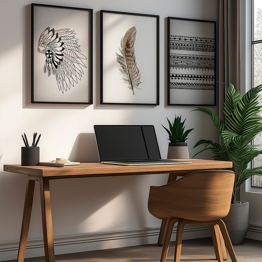 Dê alma ao seu ambiente de trabalho ou sala com o conjunto de quadros Ancestralidade. Este trio não apenas decora, mas traz uma atmosfera de identidade e serenidade que é perfeita para quem busca equilíbrio em meio à rotina. O contraste elegante entre o preto e branco e o toque natural da pena cria um ponto focal que é ao mesmo tempo moderno e cheio de história.