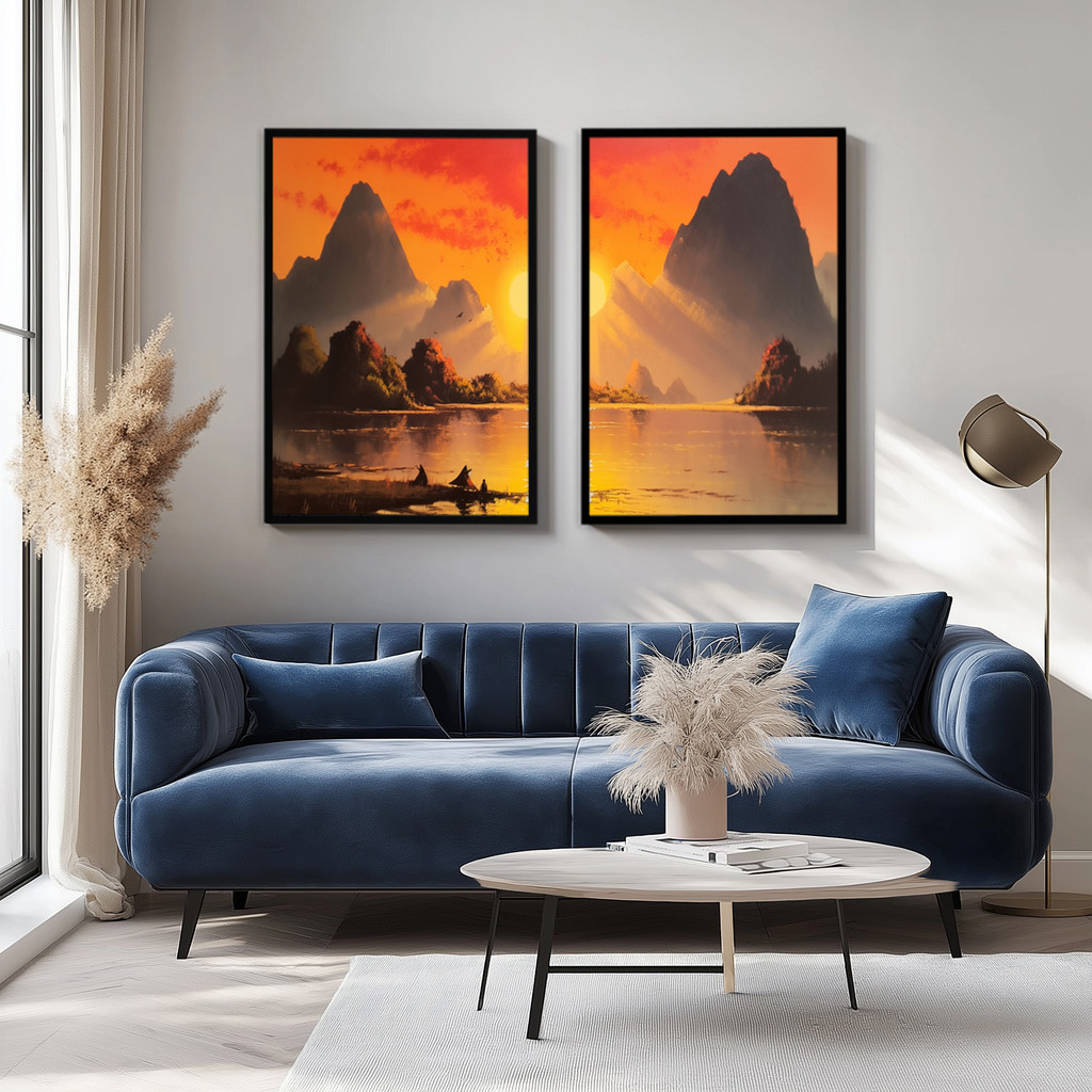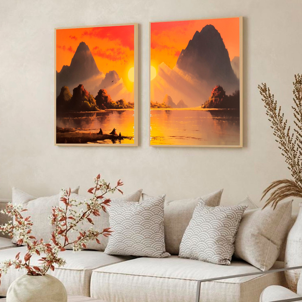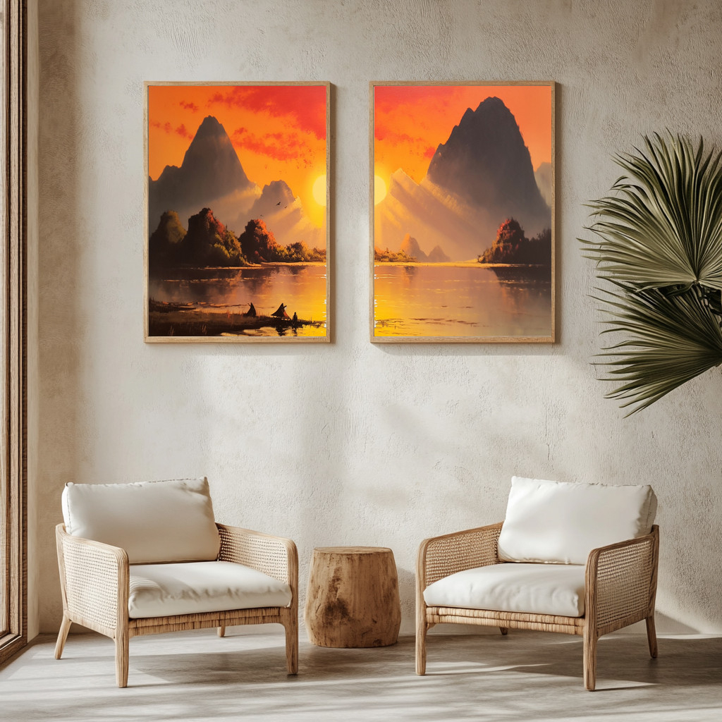 Este conjunto de duas telas retrata uma paisagem serena ao pôr do sol, onde montanhas imponentes se refletem suavemente nas águas calmas, criando uma cena de profunda tranquilidade. A luz dourada do entardecer envolve todo o cenário, transmitindo calor e contemplação.