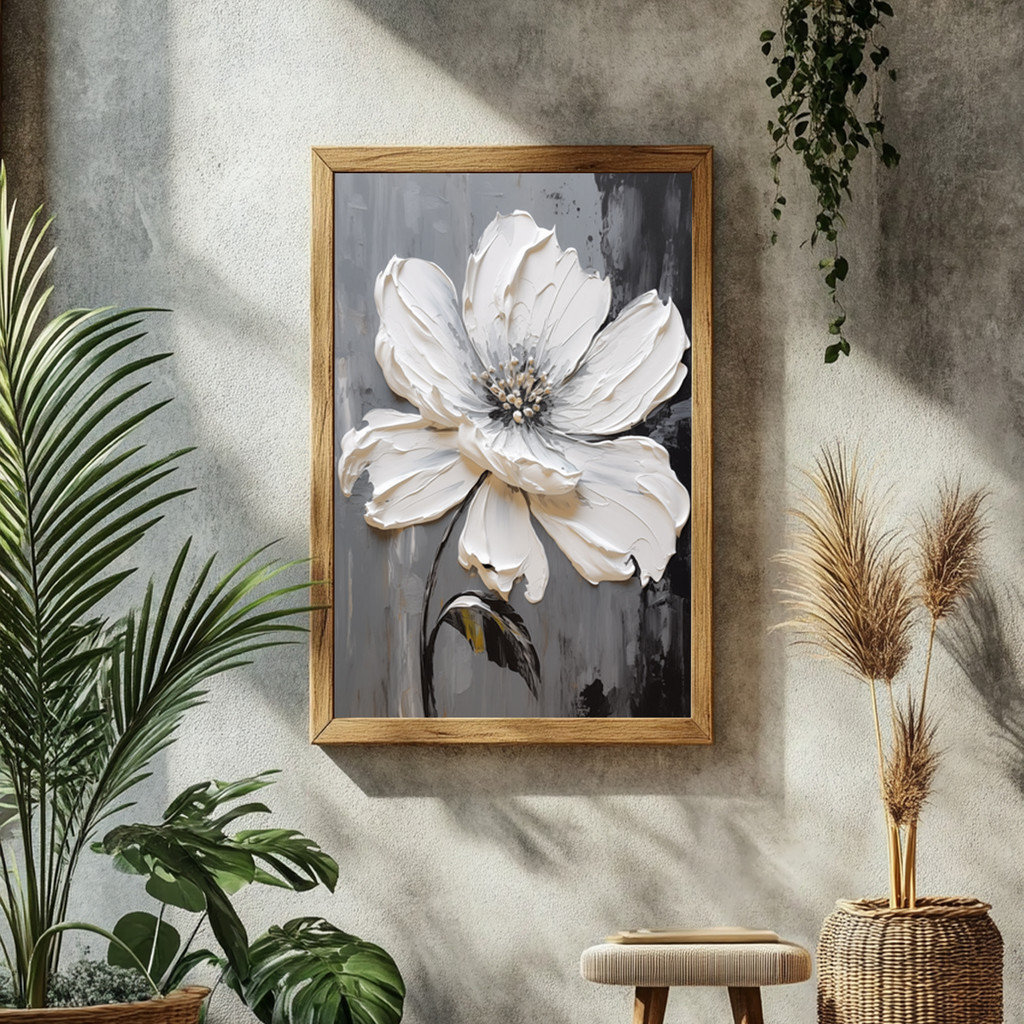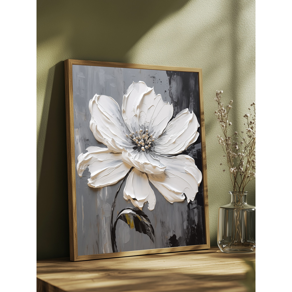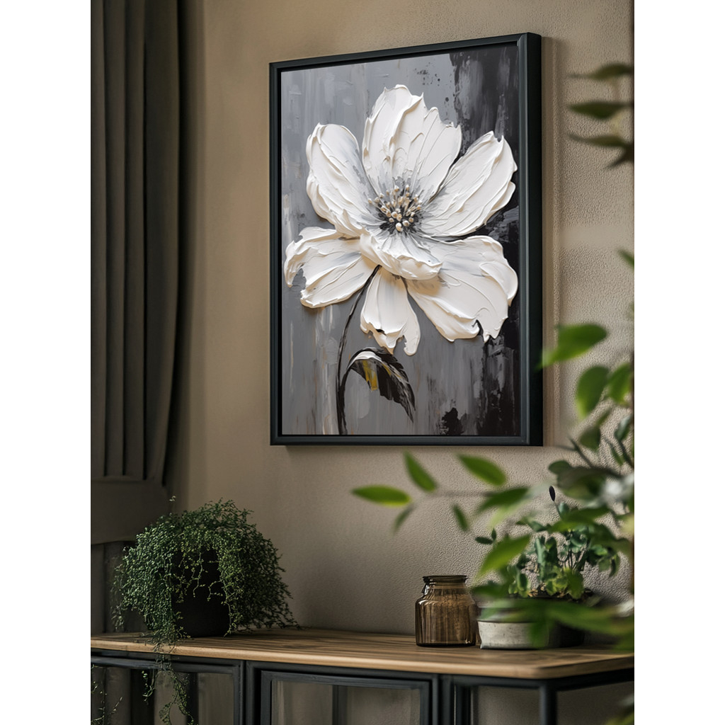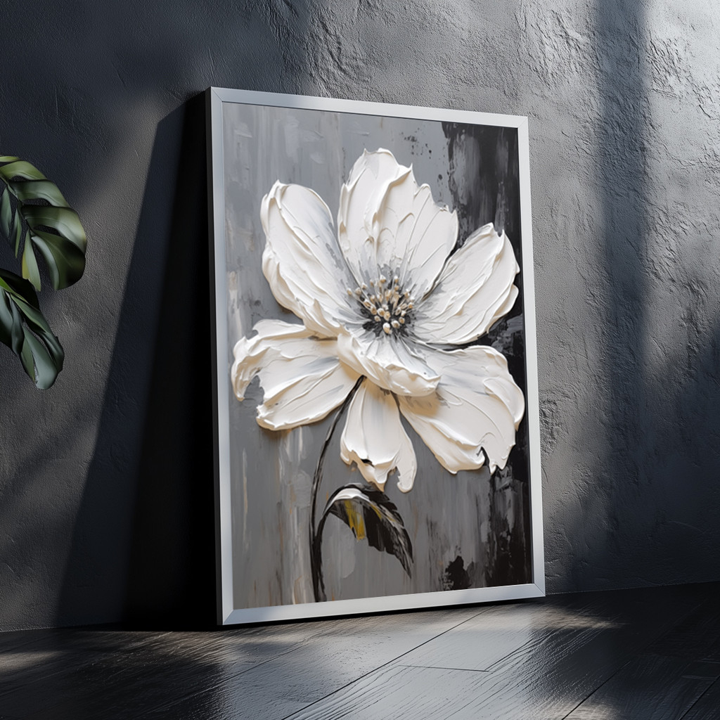 O grande fascínio desta arte reside em seu impressionante efeito visual. As vigorosas pinceladas de branco puro moldam as pétalas da magnífica flor central, fazendo com que ela literalmente salte aos olhos sobre o elegante fundo abstrato em tons de cinza, chumbo e preto. Esse contraste magistral de claro e escuro cria um jogo de luz e sombra deslumbrante, conferindo volume, movimento e uma estética de verdadeira galeria de arte contemporânea à sua casa.