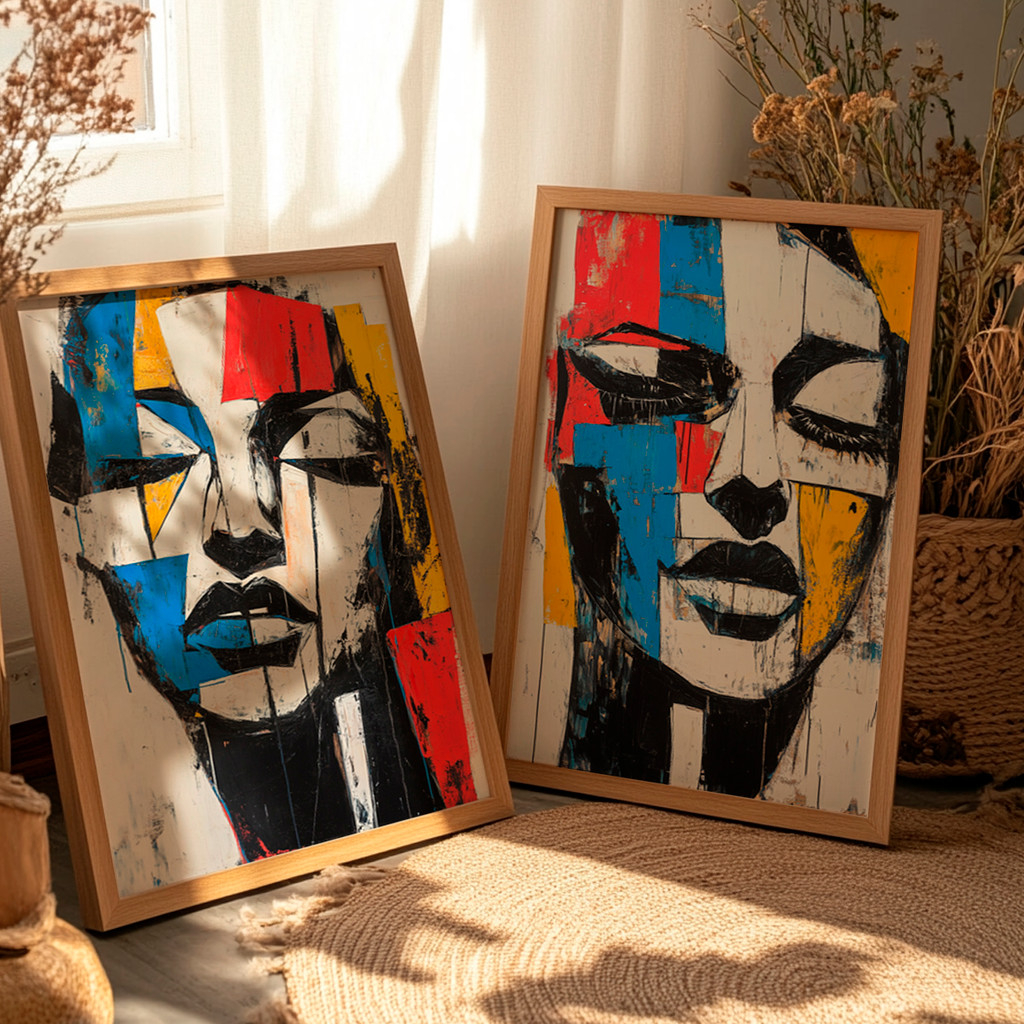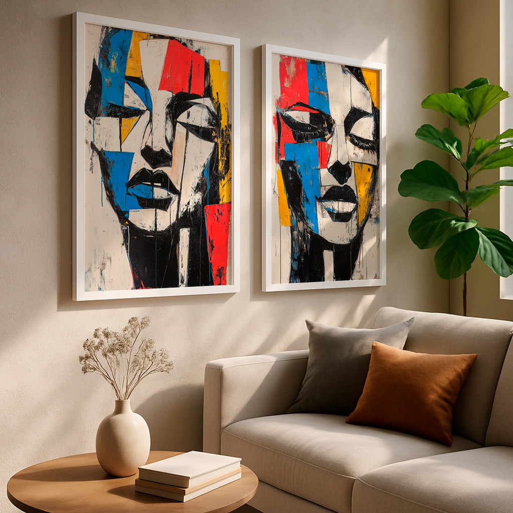 A composição magistral ganha vida através de rostos estilizados, construídos com fortes linhas pretas e blocos geométricos intensos. O uso vibrante das cores primárias: vermelho, azul e amarelo, criam um contraste espetacular com o fundo texturizado em tons de branco e creme. Dividida em duas telas de impacto, a pintura expressiva exibe pinceladas e detalhes que trazem um ar urbano, dinâmico e profundamente artístico, proporcionando uma dualidade intrigante entre as duas faces.