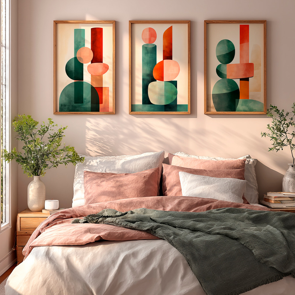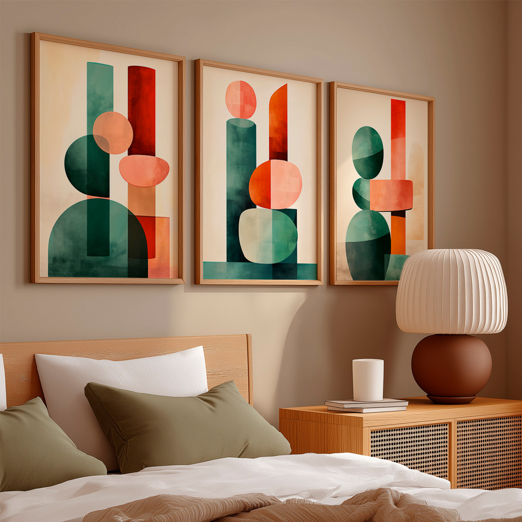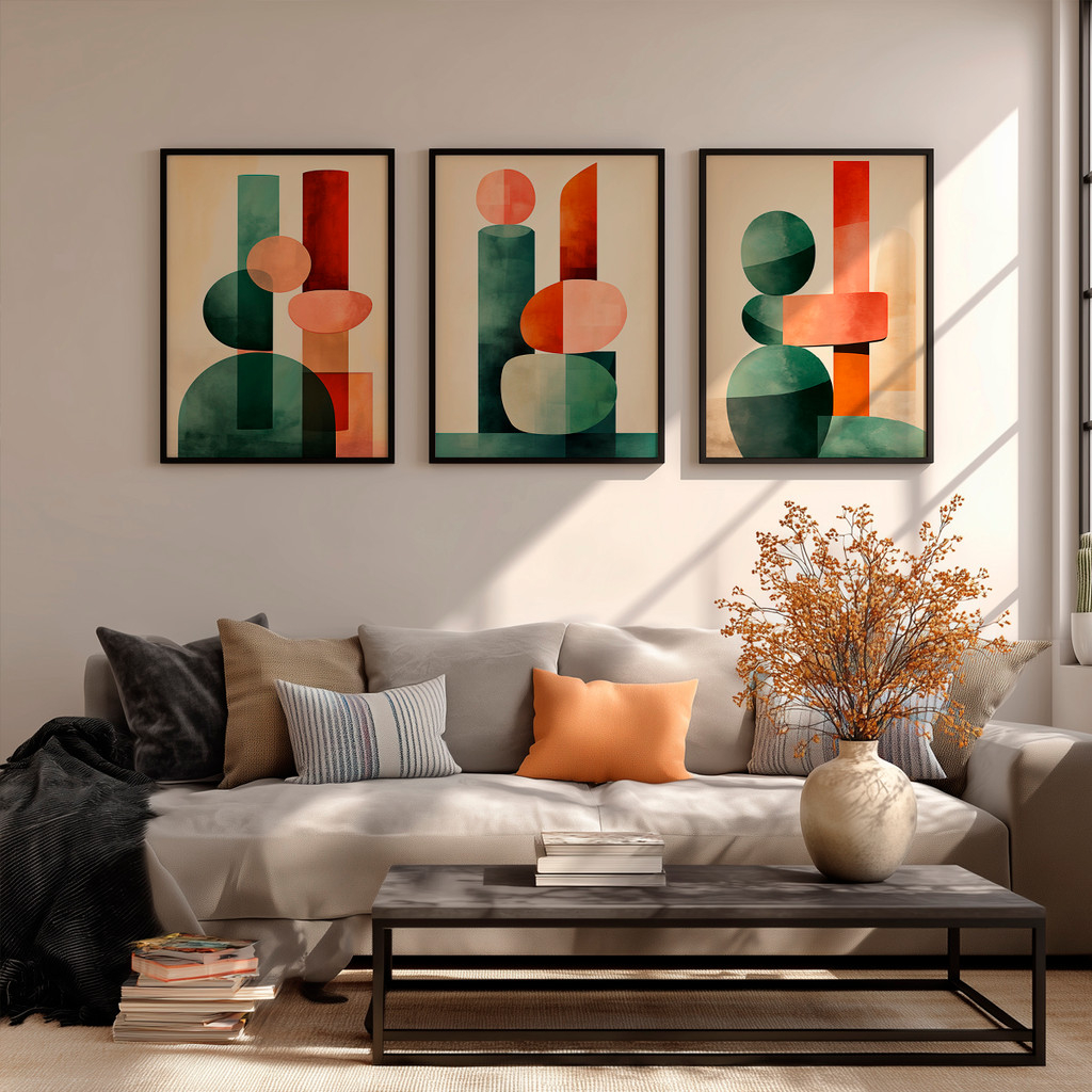À esquerda, blocos sobrepostos em verde profundo e terracota criam uma base sólida e visualmente instigante. No centro, o jogo de formas circulares e cilíndricas em tons de coral e jade ganha destaque sobre o fundo neutro, enquanto a peça da direita finaliza a narrativa visual com um equilíbrio impecável entre verticalidade e curvas orgânicas, proporcionando uma sensação de ordem e criatividade ao espaço.