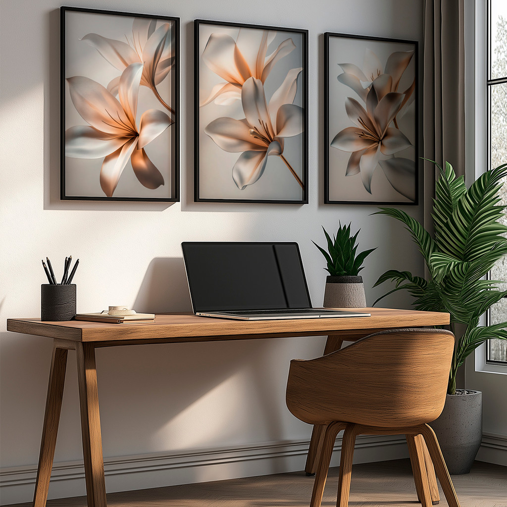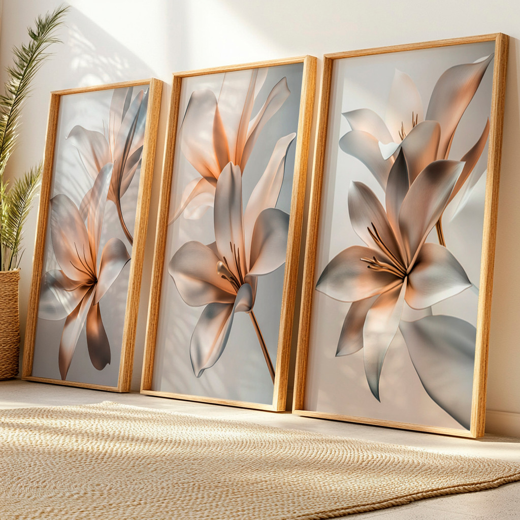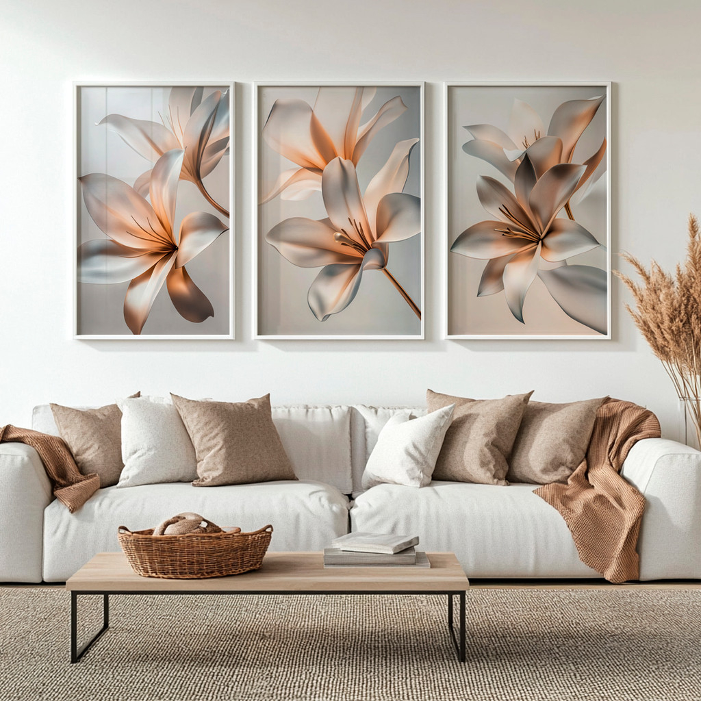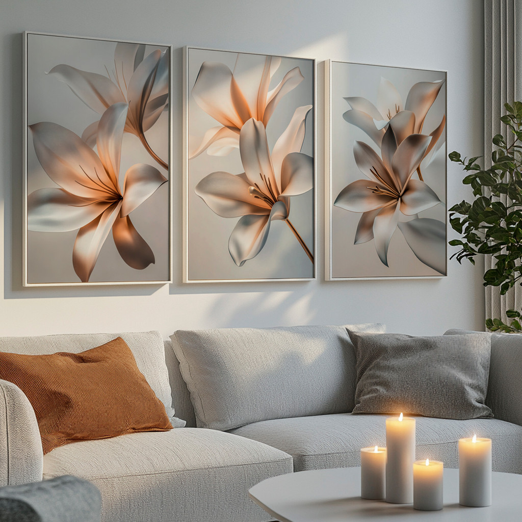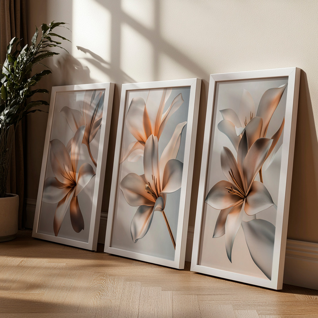 Cada tela captura a graciosidade de lírios estilizados, onde o branco perolado se funde perfeitamente com nuances acobreadas e terrosas incrivelmente elegantes. O jogo de luz e sombra nas pétalas cria um efeito quase tridimensional e fluido, que hipnotiza e atrai o olhar. É uma arte que interage com a luminosidade do seu cômodo, ganhando vida própria e garantindo que sua decoração tenha um aspecto dinâmico e envolvente em qualquer momento do dia.
