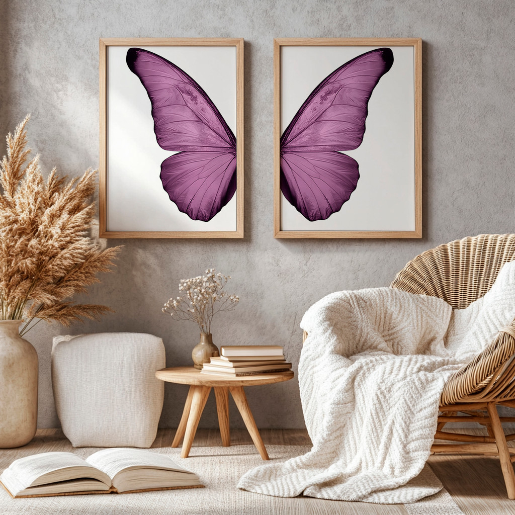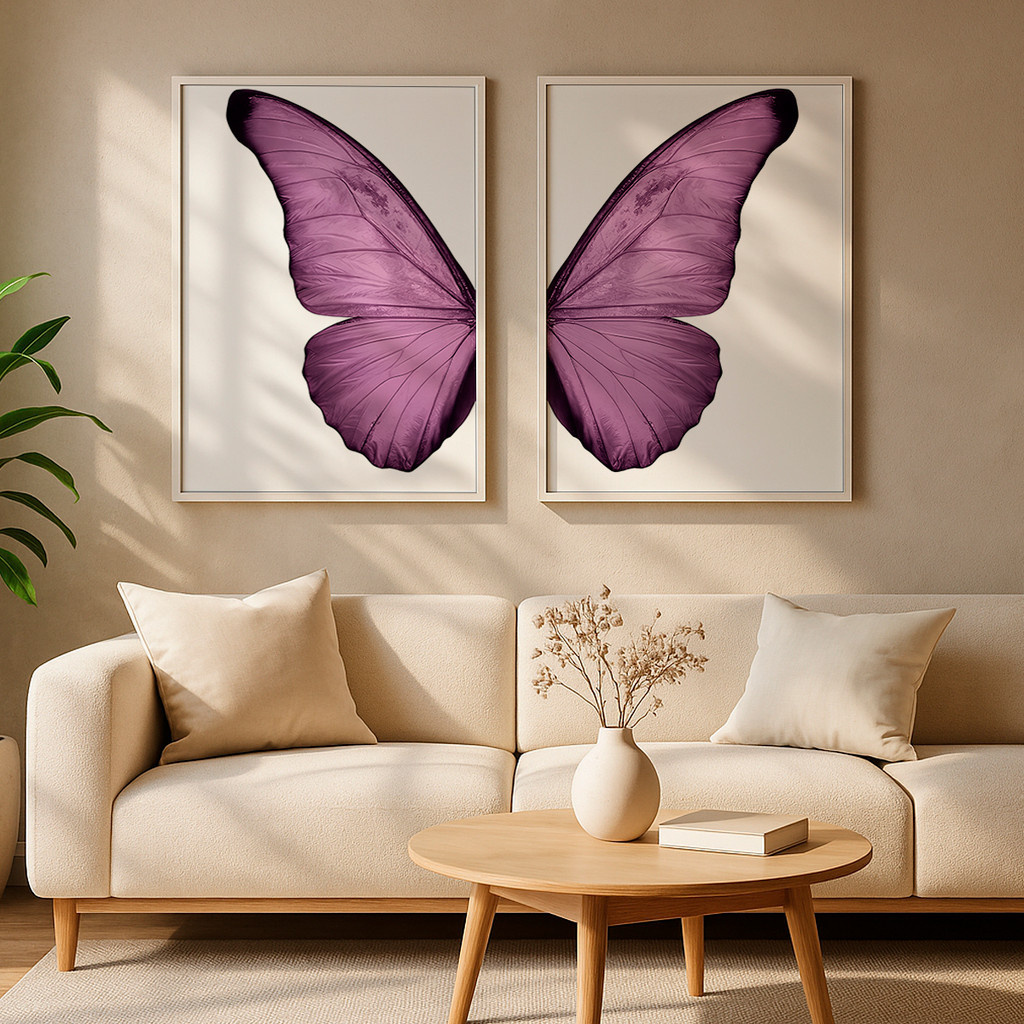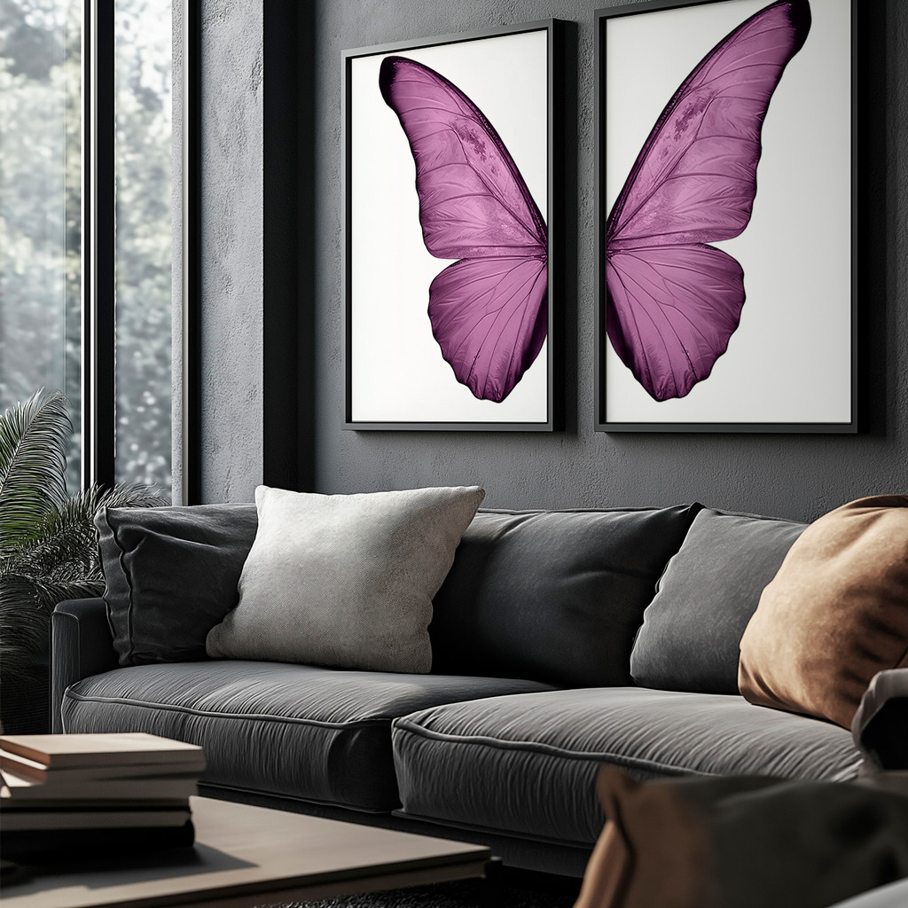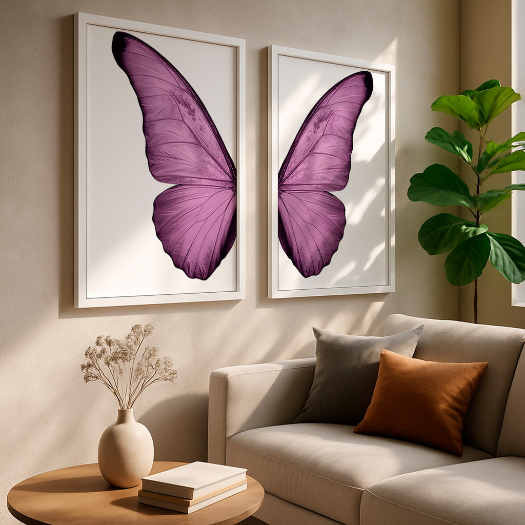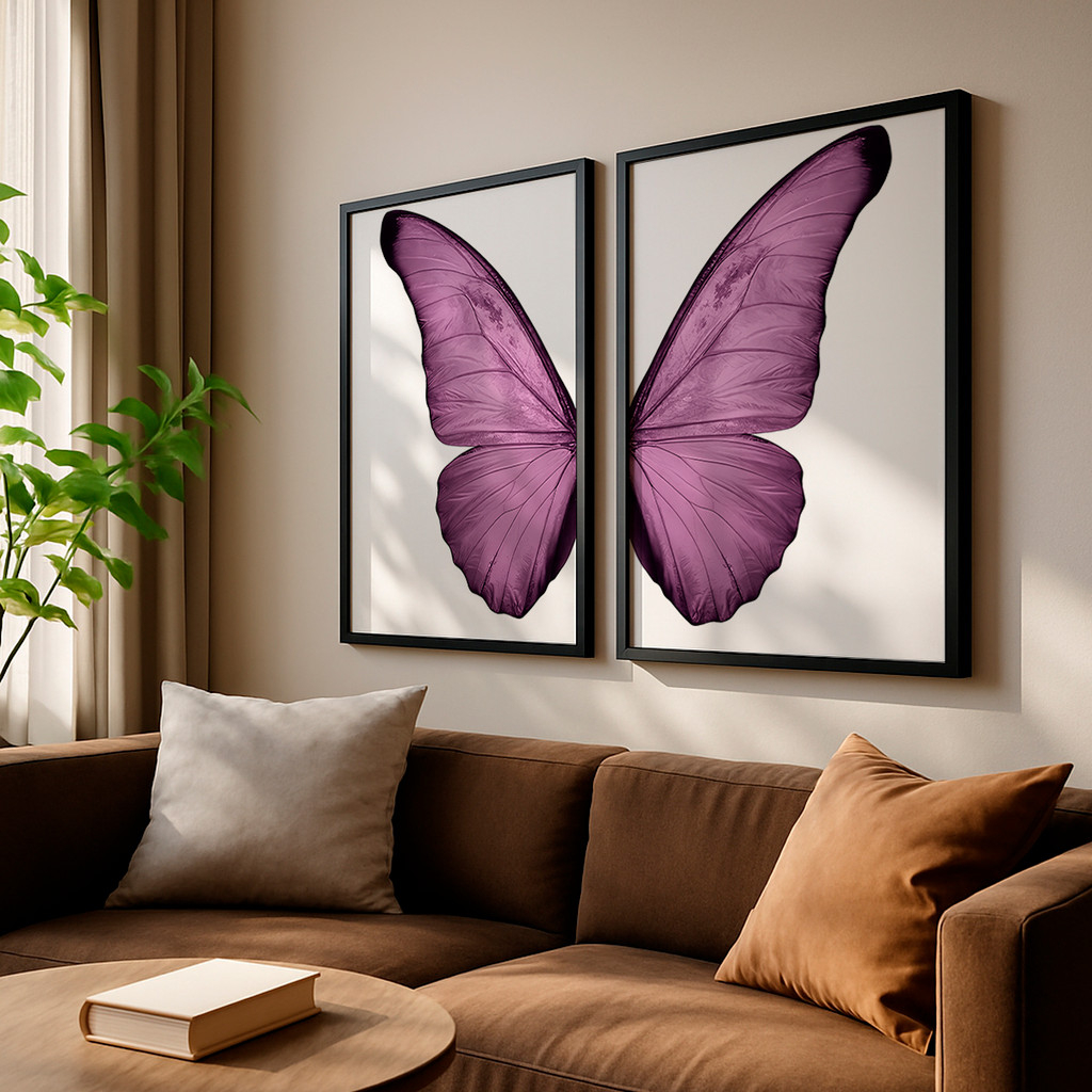 Nesta dupla, cada tela apresenta a metade exata de uma deslumbrante borboleta, capturada em um rico e intenso tom de roxo. Na tela da esquerda, as intrincadas texturas e nervuras da asa são reveladas com nitidez sobre um fundo branco puro, enquanto a tela da direita espelha essa perfeição. Juntas, elas se alinham perfeitamente para criar uma imagem coesa e visualmente impactante, irradiando serenidade e foco.