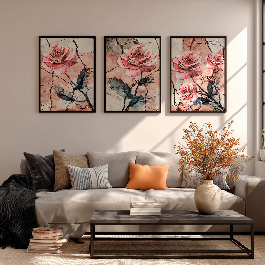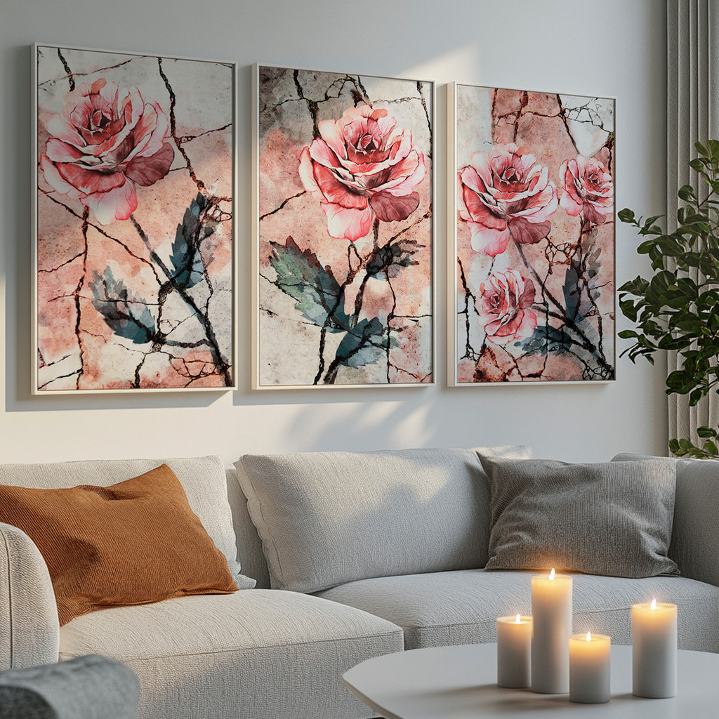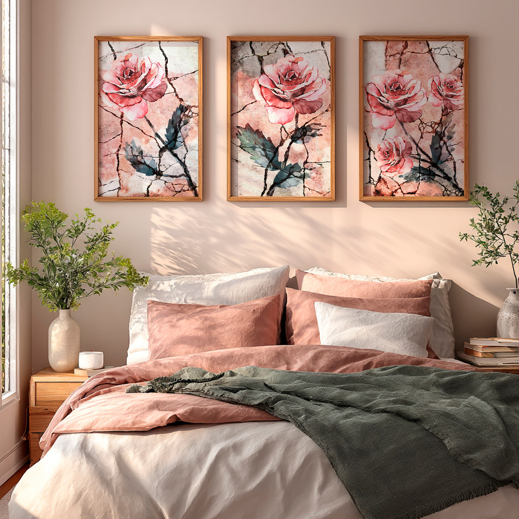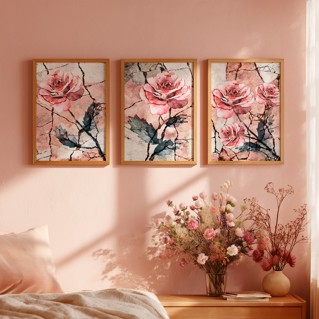 As rosas simbolizam delicadeza, força e beleza duradoura, enquanto os traços e nuances aquareladas acrescentam movimento e personalidade às obras. O visual equilibrado entre o romântico e o contemporâneo faz com que o conjunto se destaque na decoração.