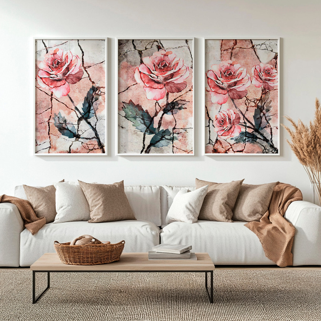Este refinado conjunto de três telas traz rosas em tons rosados delicadamente retratadas sobre um fundo com efeito texturizado, criando um contraste marcante entre a suavidade das flores e a textura do fundo. A composição transmite elegância e profundidade, transformando o ambiente com um toque artístico e sofisticado.