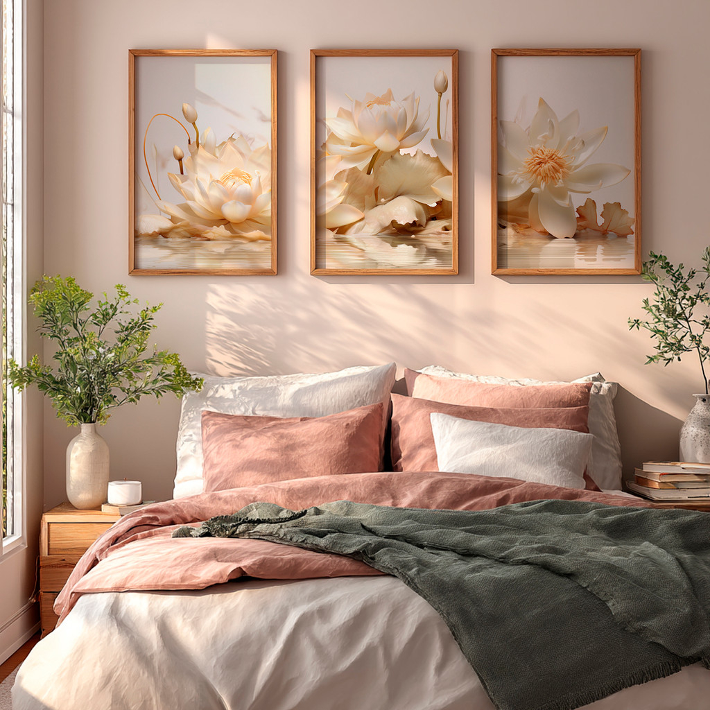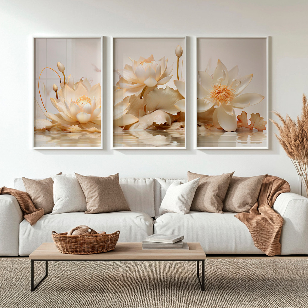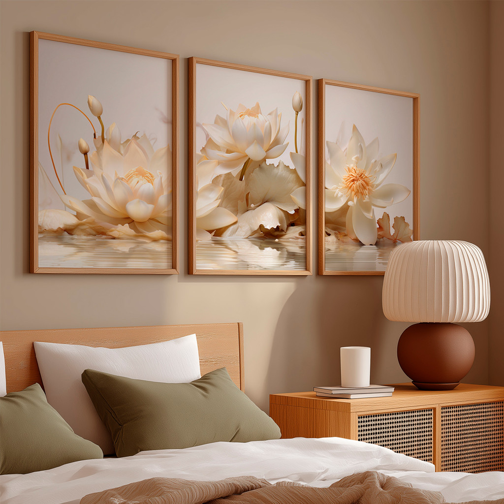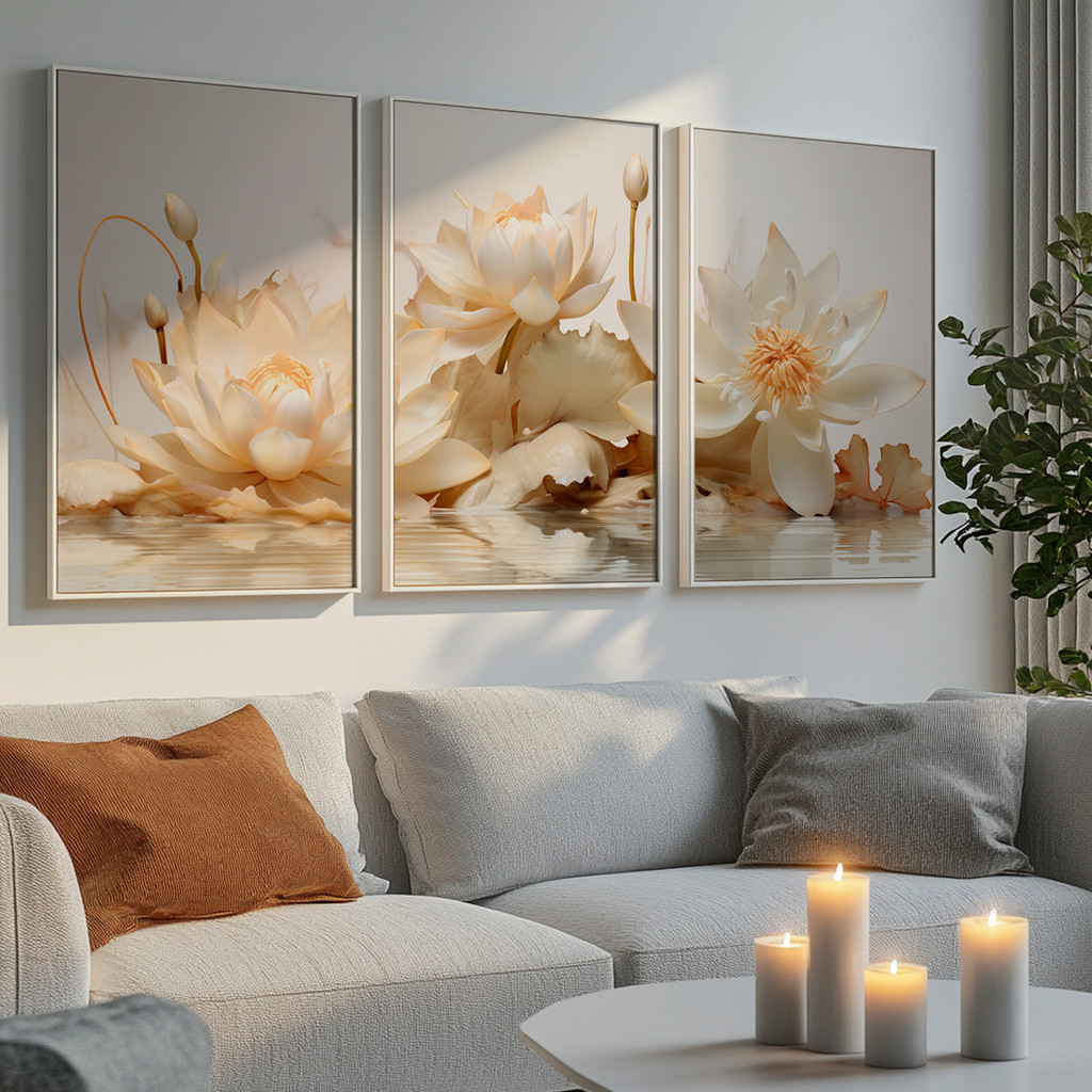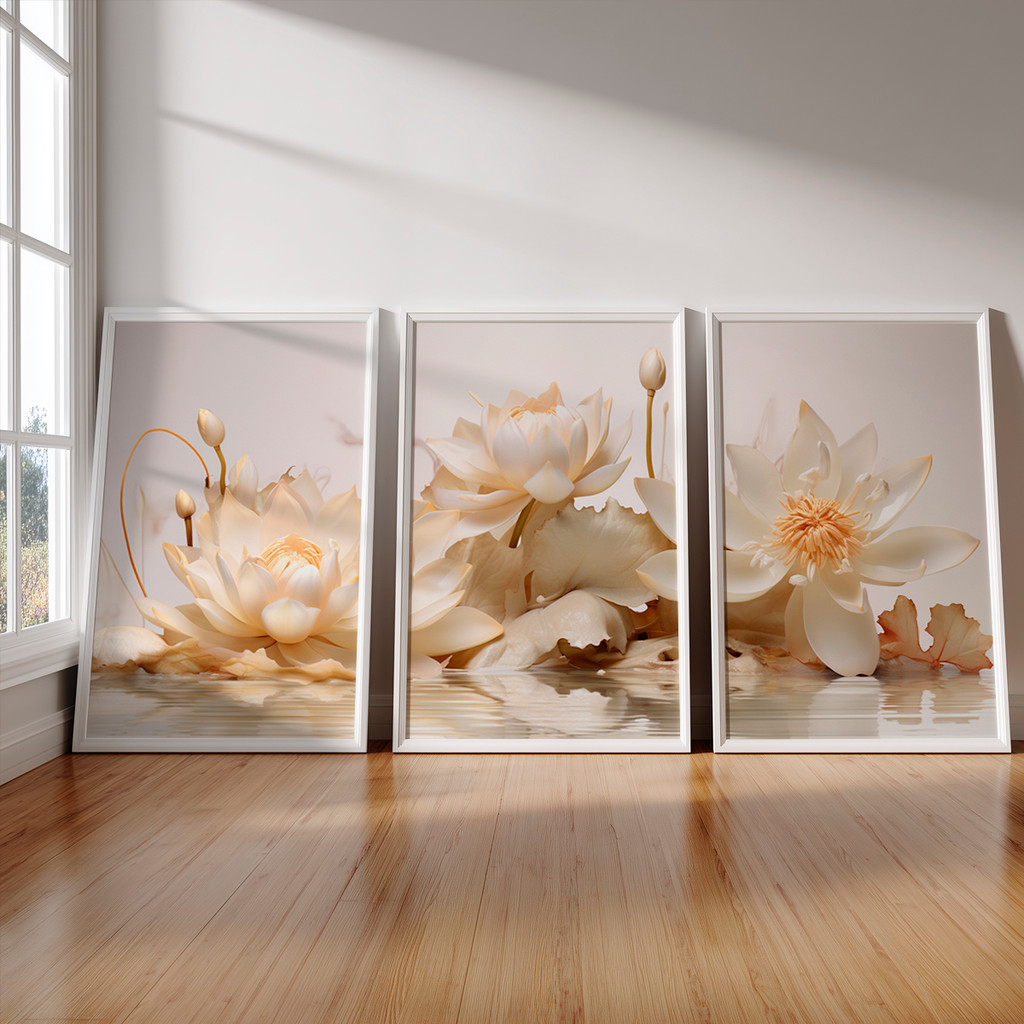 Na tela à esquerda, a jornada começa com botões delicados e uma flor que se abre suavemente sobre reflexos sutis na água, simbolizando o potencial e o recomeço. A peça central exibe a lótus em sua forma mais madura e plena, rodeada por folhas flutuantes, criando um ponto focal de serenidade absoluta. Por fim, a tela à direita completa a narrativa com a pureza de uma flor totalmente aberta e outra ao seu lado, representando a claridade mental e a harmonia alcançada, tudo banhado por tons creme e dourado.