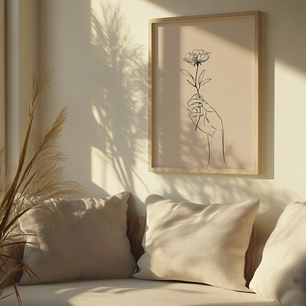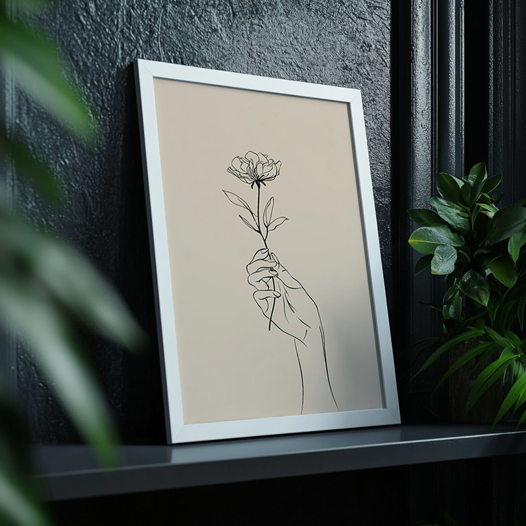 O centro da obra apresenta uma mão feminina estilizada, cujos traços finos e graciosos envolvem delicadamente uma única peônia em florescimento. Mais do que um desenho, este gesto simboliza a oferta de um momento de paz, carinho e renovação, capturando a beleza de um instante simples. O contraste entre a precisão da linha preta e a suavidade do fundo nude cria um equilíbrio visual que transmite calma e harmonia instantâneas.