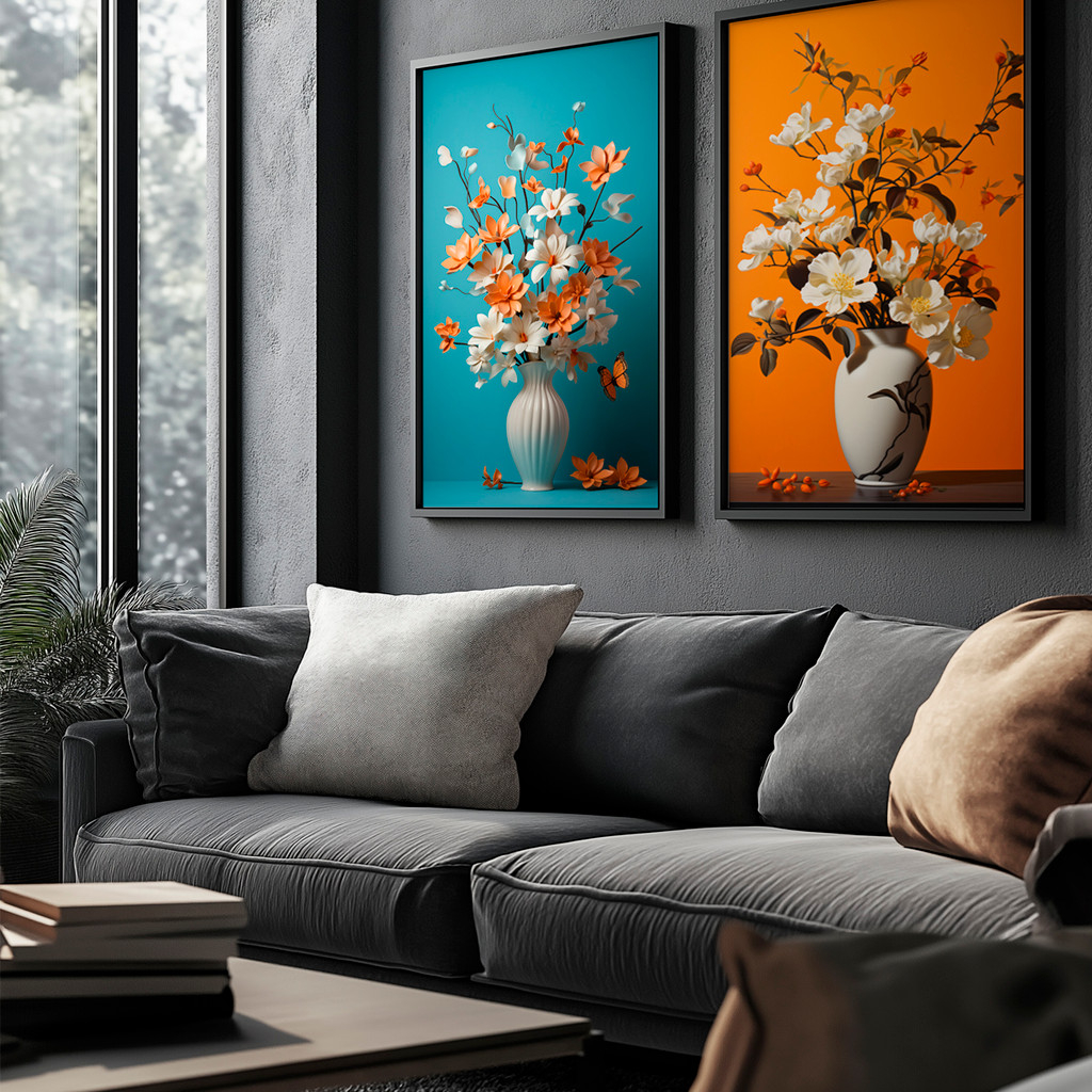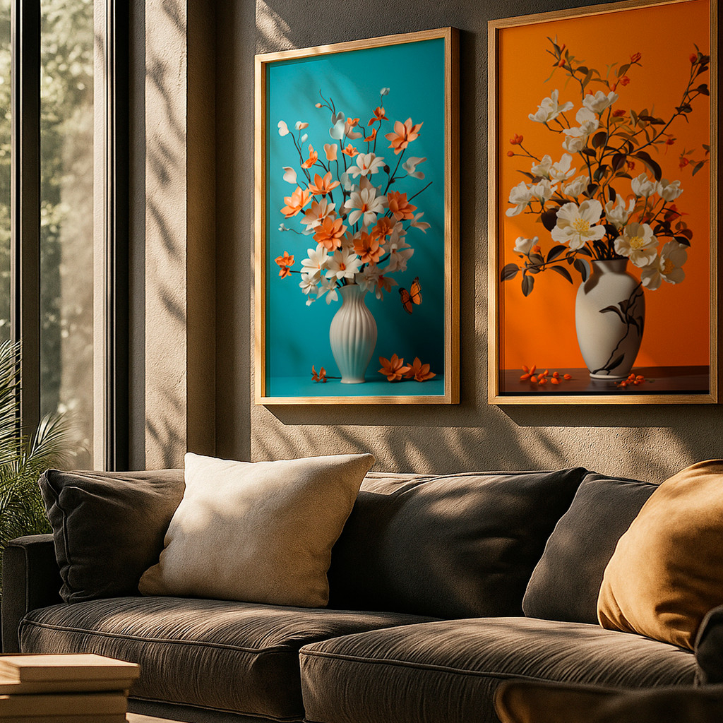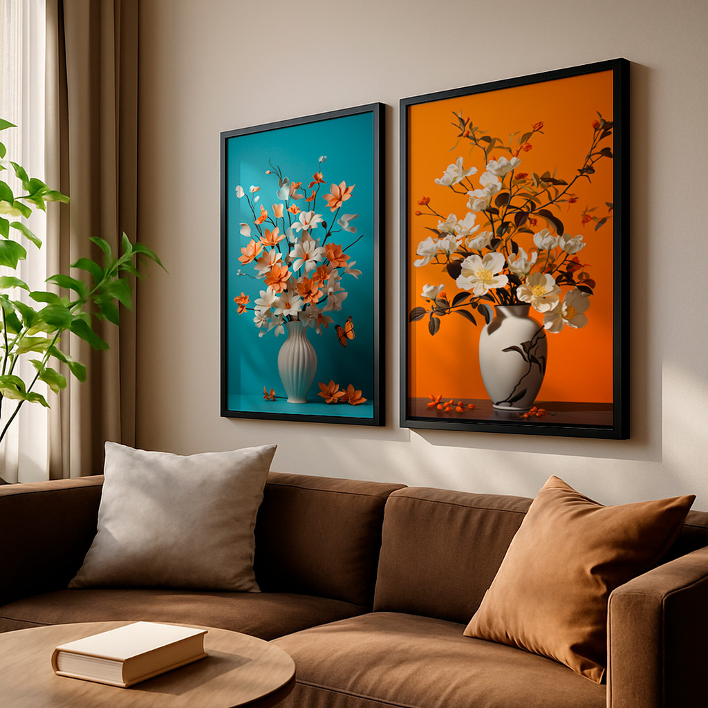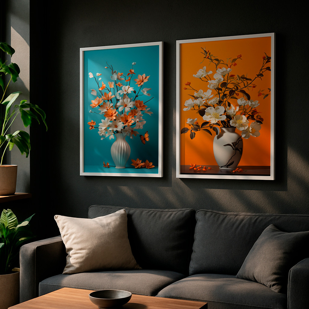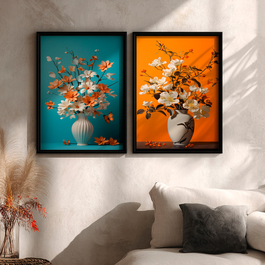 Esta dupla de quadros apresenta arranjos florais exuberantes dispostos em vasos elegantes, cada um com um fundo vibrante que realça ainda mais a composição. A combinação do azul turquesa e do laranja intenso cria um contraste moderno, capaz de transformar qualquer ambiente com personalidade e estilo.