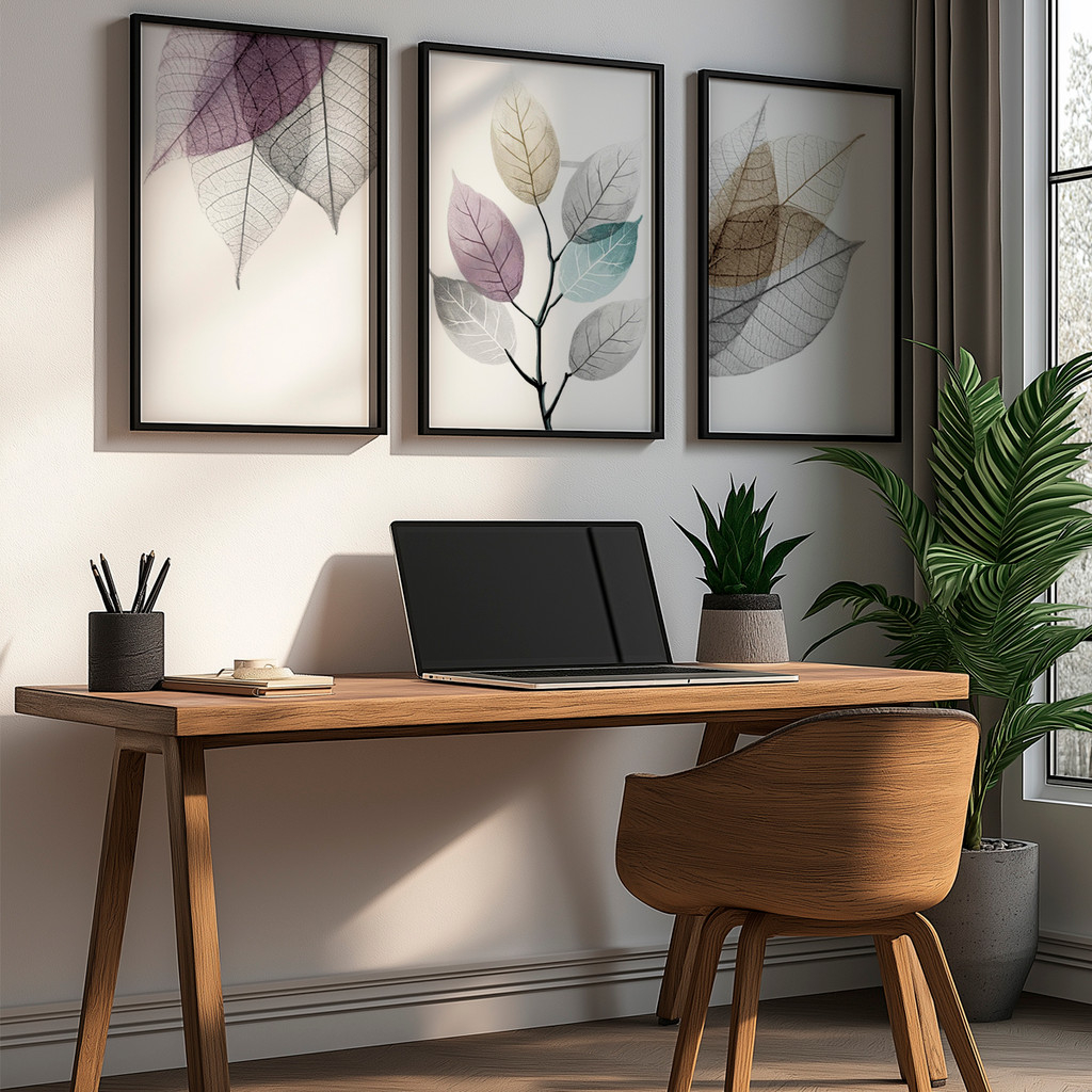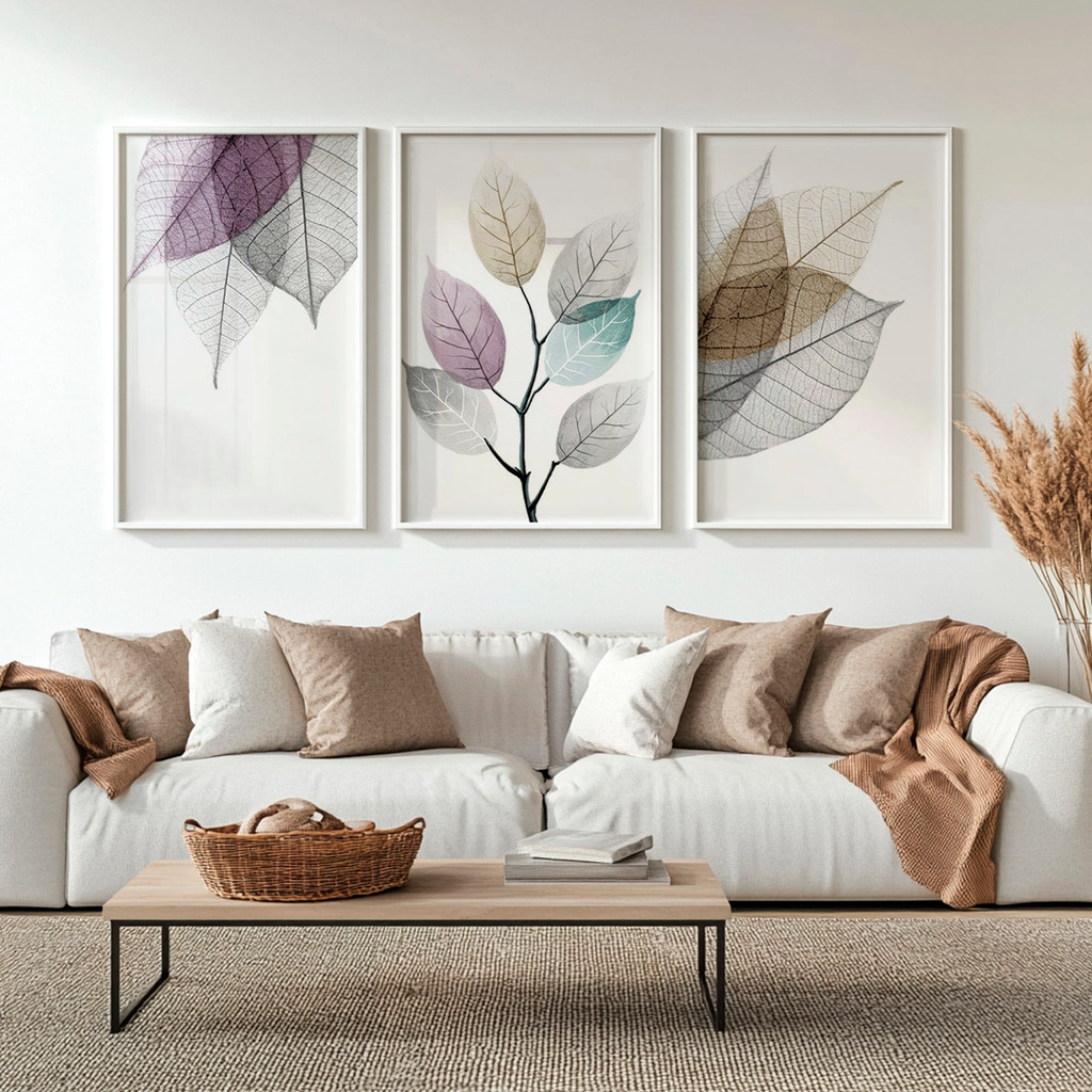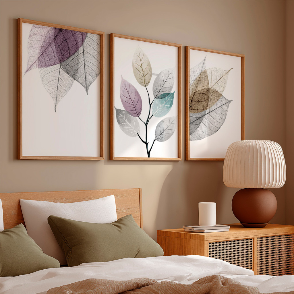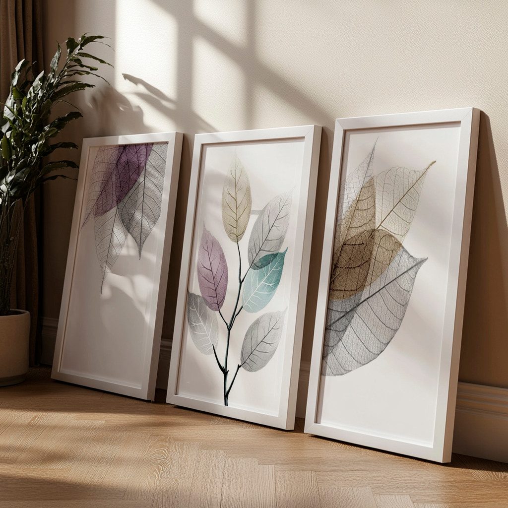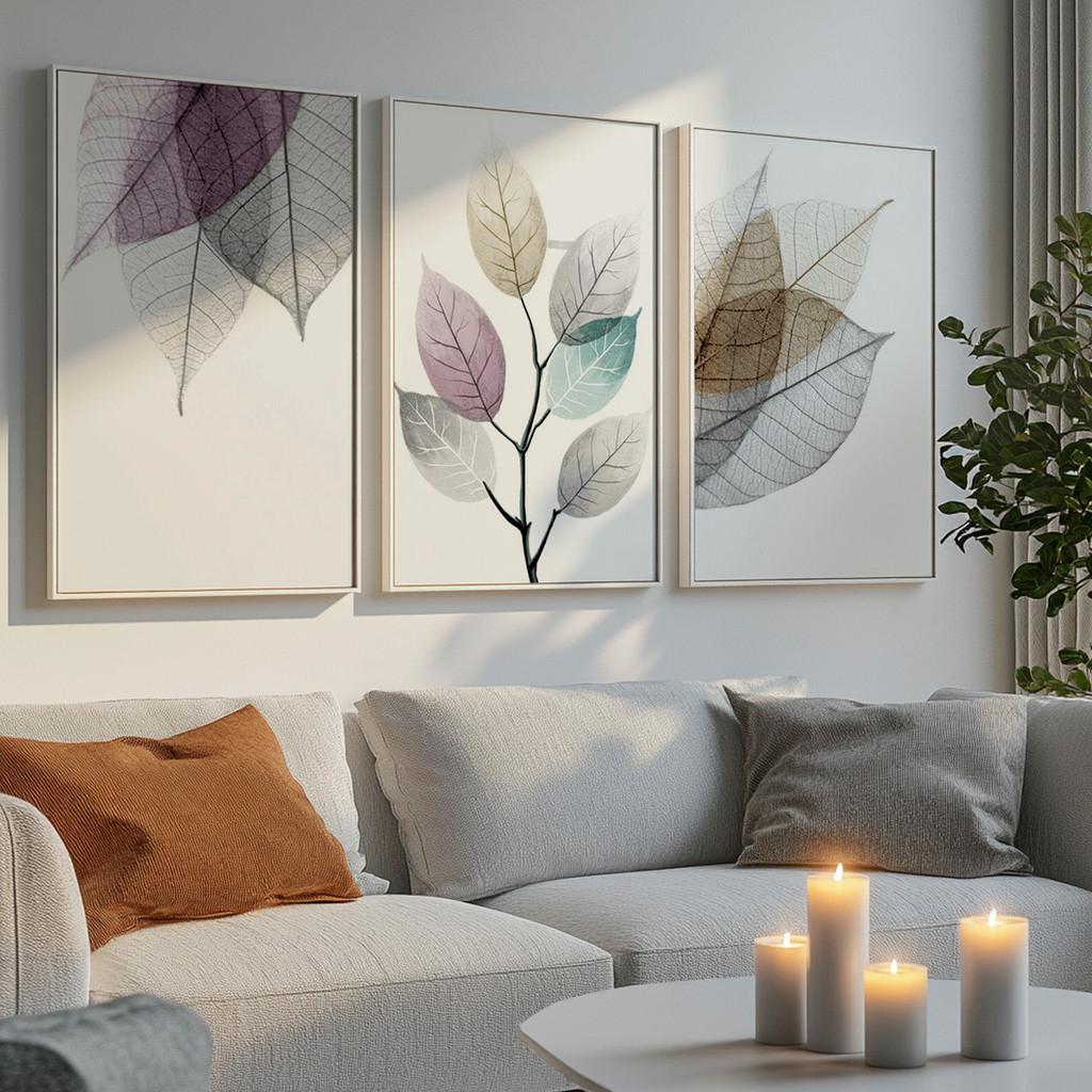 O Quadro Folhas Marcantes traz a beleza das formas naturais em composições delicadas e elegantes. Cada tela apresenta folhas translúcidas em tonalidades harmoniosas, criando um visual leve e sofisticado que transforma qualquer ambiente com sutileza.