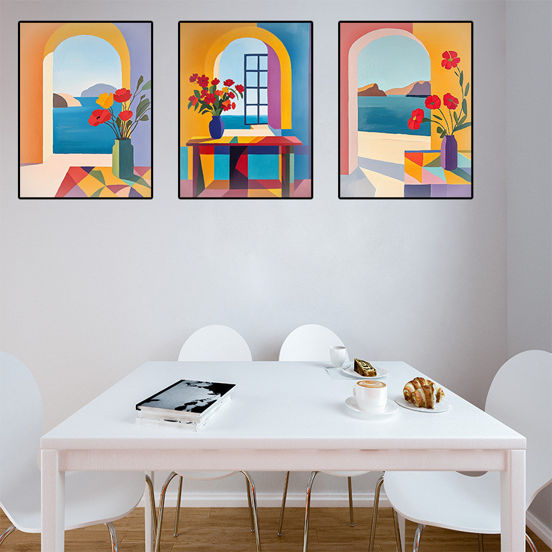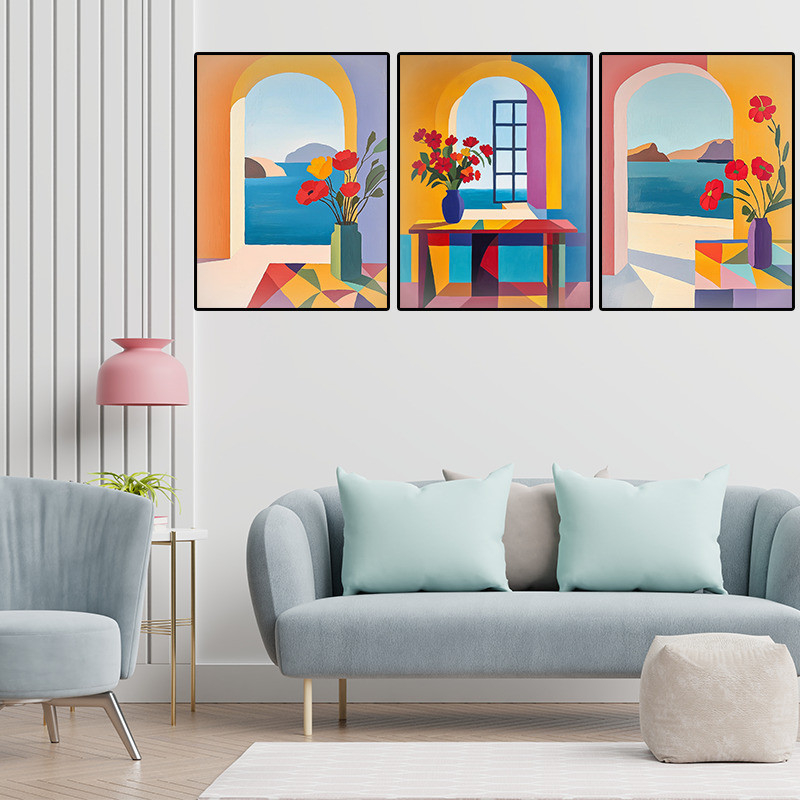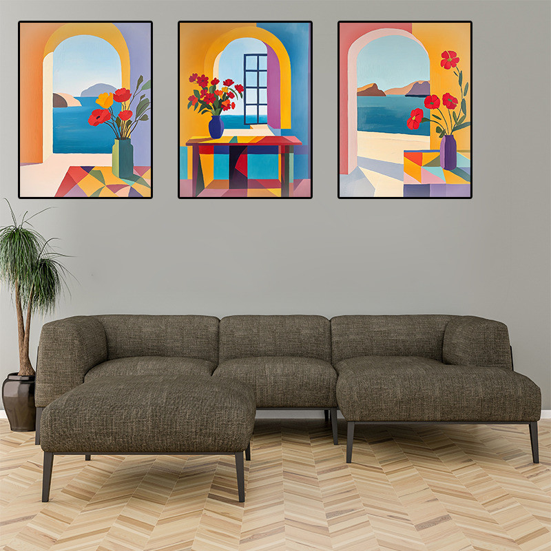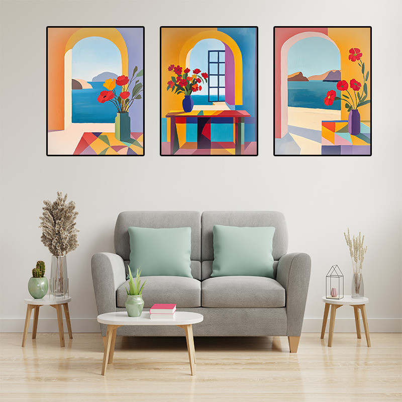 O Quadro Aconchego ao Mar traz a beleza das paisagens litorâneas através de composições modernas e vibrantes. Cada tela apresenta uma vista para o oceano, composta por arcos arquitetônicos e decorada com flores, criando a sensação de tranquilidade e aconchego.